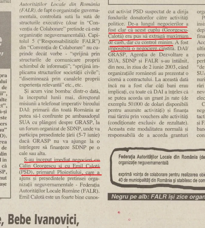 În text sunt aduse în discuție numele baronilor PSD Marian Oprişan, Nicolae Mischie, Bebe Ivanovici şi Gavril Marza, care au ajuns să dispună şi de banii contribuabililor americani. Prin intermediul Federaţiei Autorităţilor Locale din Romania (FALR), condusă de Octav Cozmâncă, organizația s-ar fi erijat s-a erija într-un fel de ONG, primind finanţări prin Programul GRASP, Ministerul Afacerilor Externe din Elveţia, Programul Naţiunilor Unite pentru Dezvoltare (PNUD), Ambasada Canadei, Ambasada Olandei şi alte organisme internaţionale.