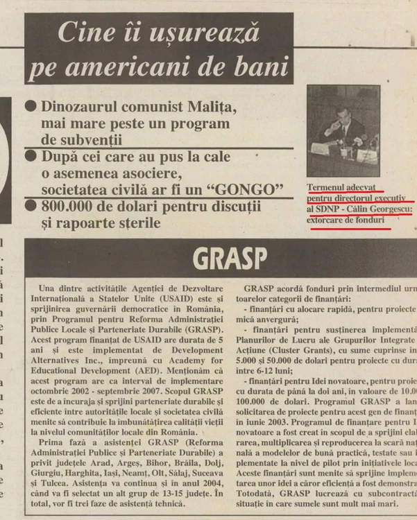 Practic, trei angajaţi ai programului GRASP (Reformă Guvernamentală şi Parteneriate Durabile) ”se arață scandalizați şi revoltaţi din cale afară că această subvenţie, în fond, în valoare de 36 milioane de dolari, pe o durată de cinci ani, destinată birourilor din Bucureşti, Sibiu, Iaşi şi Oradea şi activităţii din 14 judeţe, a devenit un fel de anexă a primarilor pesedişti, prin preşedintele CA al Centrului Naţional pentru Dezvoltare Durabilă (SDNP), nimeni altul decât dinozaurul comunist Mircea Maliţa şi directorul său executiv Călin Georgescu. Plângerea se referă la presiunile exercitate de partea romană asupra agenţiei care distribuie banii – DAI (Development Alternatives Inc.) – pentru a acorda un grant unei organizaţii romaneşti fără a se ţine seama de importanţa capacităţii tehnice, controlului financiar sau legitimităţii politice a acestei organizaţii romaneşti. DAI, de fapt, nu numai că distribuie banii, dar şi evaluează proiectele”, arată ziariștii.