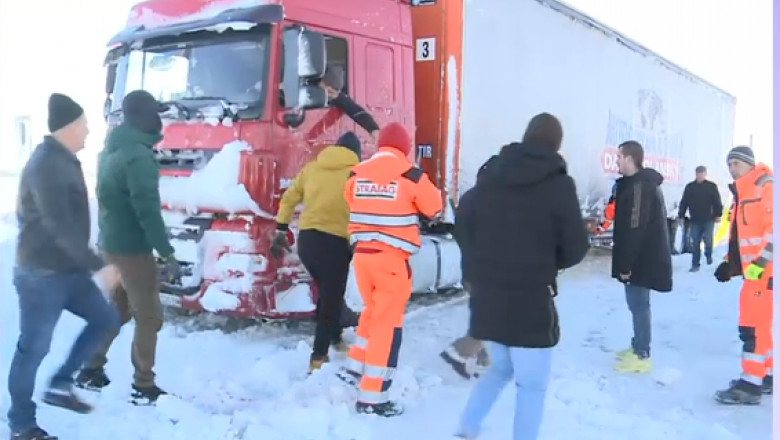 Mai mulți oameni încearcă să scoată din zăpadă un TIR care blochează încă de ieri un drum din județul Constanța, lângă localitatea Dorobanțu. Șoferii vor să dea zăpada la o parte cu lopeți sau chiar cu mâinile goale. În zonă s-a format o coloană de mașini în care se află chiar și un utilaj care trebuia să deszăpezească.