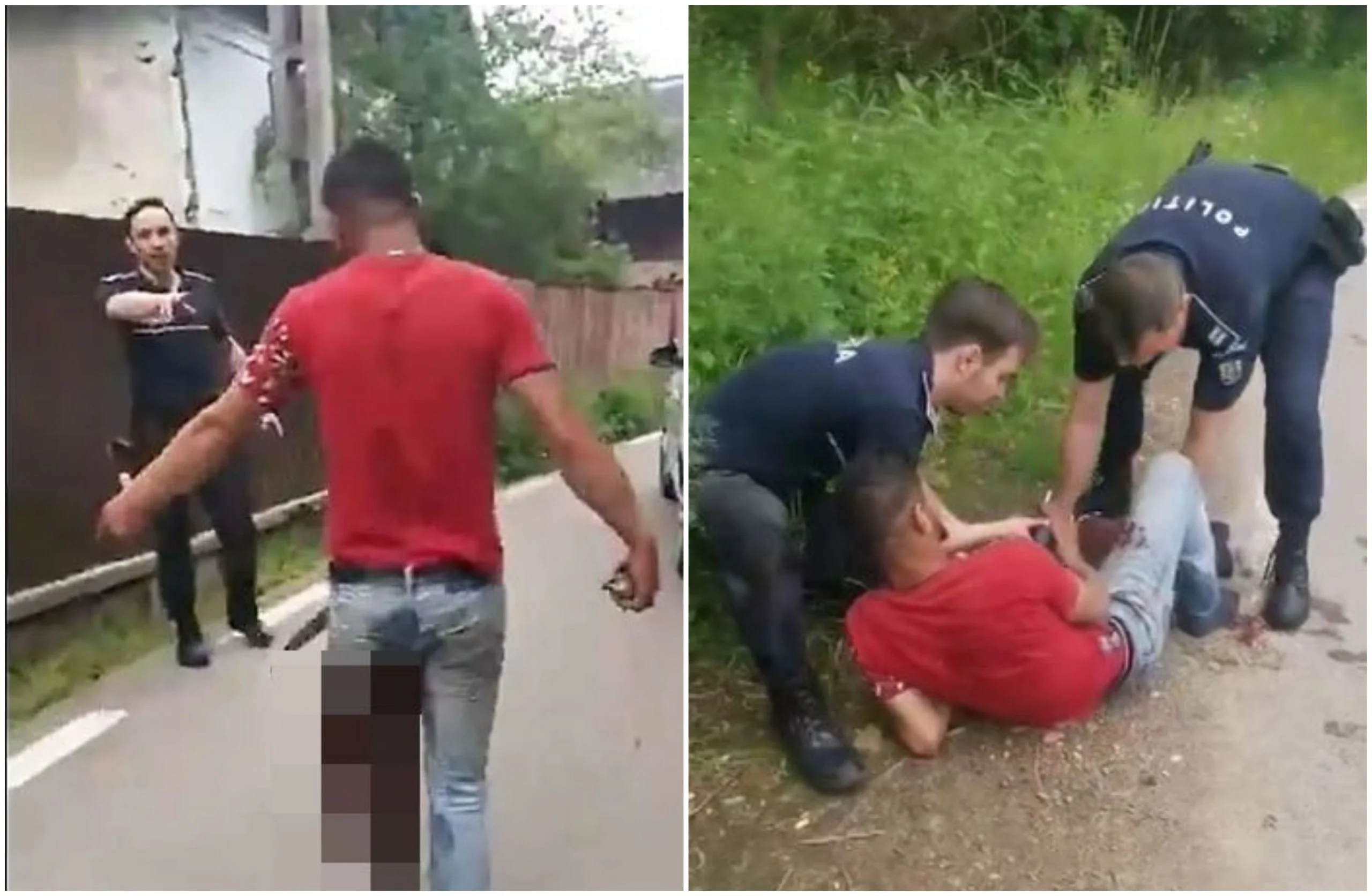 Imagini șocante aseară în Huedin, județul Cluj. Un tânăr a fost împușcat în picior de polițiști, iar imediat după incident, s-a plimbat pe stradă, plin de sânge. Urmează imagini și informații care vă pot afecta emoțional.