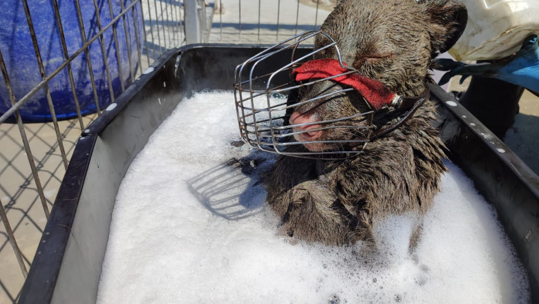 „Ciprian, fost voluntar la Help Lăbuş, a fost apelat de un prieten, care i-a spus că aude de câteva ore plânsetul unui câine şi că i-a luat ceva timp să identifice locul de unde vine exact acel plânset, respectiv o cisternă de pe timpuri, de unde se scurgea combustibil şi ulei. Căţelul era căzut în acea cisternă. Ciprian şi Ionuţ, cei doi tineri curajoşi, au improvizat un laţ cu o scândură şi au reuşit să îl scoată, iar noi l-am preluat în adăpost. A fost foarte greu pentru ei să respire în uriaşul recipient, însă nu au renunţat la bietul câine, care striga după ajutor. Le mulţumim din suflet pentru asta. Cert este că doar o minune a făcut să fie scos în ultimul ceas şi să supravieţuiască. Colegele mele care l-au spălat mi-au spus că nu mai puteau respira, deoarece ceea ce emana în jurul lui era foarte toxic pentru oameni, nu ştiu el cum a putut să supravieţuiască atâtea ore în acele noxe foarte puternice. Era plin de o substanţă uleioasă şi, în primă fază, l-am spălat cu detergent de vase, dar nu s-a luat absolut deloc. Noi am mai avut experienţă cu un câine care a căzut în smoală şi căruia i-am curăţat blana cu ulei alimentar. Am zis să încercăm şi acum cu ulei alimentar, lucru care a funcţionat. L-am spălat cu sticle întregi cu ulei alimentar”, a declarat, pentru AGERPRES, preşedintele Asociaţiei „Help Lăbuş”, Corina Grigore.